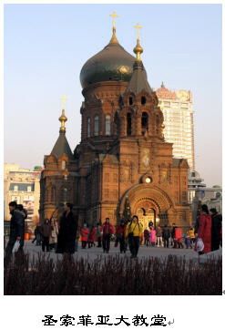 它是远东地区最大的东正教堂,是拜占庭式建筑的典型代表,是哈尔滨独具异国情调的人文景观。来到教堂下面,我们便被它巍峨壮美,气势恢弘的外表吸引了。墙体全是红砖,上面是巨大的圆形穹顶,正门顶部为钟楼,里面有七座铜铸的乐钟。进入教堂,我们更是被里面精美的绘画钉住了脚步。吸引我们的还有它的历史,圣索菲亚教堂是沙俄为了侵占哈尔滨,为了稳定远离家乡士兵的军心而建的,所以它又是沙俄入侵东北的历史见证和研究哈尔滨市近代历史的重要珍迹。