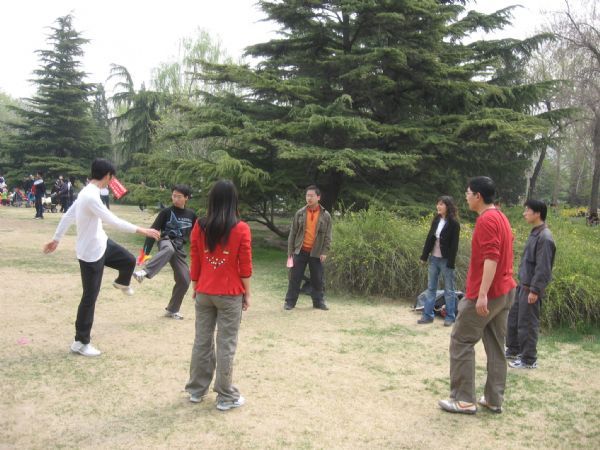 下午一点,五个小组在公园西门胜利“会师”,大家坐在草地上,各自谈论着彼此的经历,短短几个小时,大家都收获颇丰。又有一些同学自发的组织踢毽子、打扑克……在胜春的光景中,韵味是那样的绵绵流长,仿佛我们都在纯真年代的渡口,舞动自己含蓄的微笑,芳草茵茵、花团锦簇,再加上青春活力,定格成一副不老的图画,在图画的里就是我们神往的桃花源,没有尘世的喧闹,没有琐碎的烦恼……