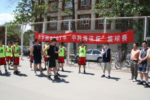 今天中午,在中科院力学所篮球场,举行了简短的开幕式。声学所党委副书记王小民、中科海讯董事长蔡惠智、团委书记张云鹏分别发表讲话。本次比赛的赞助方——中科海讯董事长蔡惠智风趣地说,中科海讯非常愿意赞助这样的比赛,如果有机会,中科海讯还将赞助明年以及以后的每次篮球比赛,博得现场热烈的鼓掌和欢呼声。