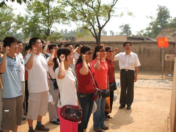 随后我们来到中共中央旧址进行参观。中共中央旧址占地面积16440平方米,建筑面积2600平方米。西柏坡旧址其实是50年代修建水库后复原建设的,但伟人们的旧居以及中共七届二中全会会场仍然风采依旧,一切都是那么朴素而整洁。在毛泽东、朱德、刘少奇、周恩来、任弼时、董必武同志的旧居前,大家感慨万千,对老一辈们艰苦朴素作风的敬佩之情油然而生;在中央军委作战室旧址前,在这样一间容纳三个科的小小的指挥室里,老一辈们带领全党取得了一个又一个胜利,大家深切缅怀老一辈无产阶级革命家的丰功伟绩;在七届二中全会旧址前,全体党员在王小民副书记的带领下,重温入党誓词,大家热血沸腾,慷慨激昂,仿佛又回到了刚刚入党时的情景,一字一句,高亢有力,迸发了心底最真诚的誓言,在这里全体党员还重温了毛泽东同志在党的七届二中全会上提出的“两个务必”,进一步增强了大家的先进性意识和艰苦奋斗的意识。