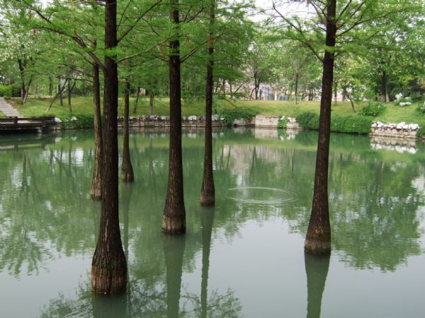 似乎是个清晨,大概是空山新雨后,空气潮润耳清新,混有野花的清香,让人宁静。这是一块真正幽静的雅地,于喧闹的尘世中,水杉亭亭玉立。是蜻蜓点水之后的涟漪么?一圈一圈,荡起心中的恬淡,来清洗灵魂中的世俗。情怀所至,满目翠色欲滴。日的微暖,风的轻抚,水的悠悠,影的明澈……隐隐约约、飘飘忽忽映在这幅颜色纯净的让人爱不释手的摄影作品里。轻吟浅唱的潇洒也好,悠然见南山的自得也罢,都在清幽之中觅得一丝丝静谧。