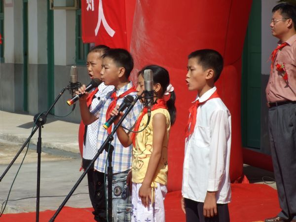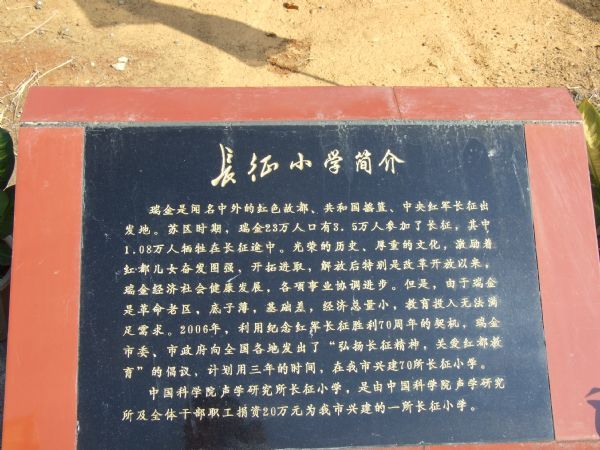 凤岗小学距离瑞金市中心大约半小时车程,我们到达那里时,刚好是上午9点。远远地就看见校门两边各有一行标语“办好教育为人民”、“ 人民教育人民办”。一踏入校门,一栋崭新的白色二层教学楼映入眼帘,在蔚蓝的天空下显得洁净、质朴,更饰以数条红色的彩带,上书“热烈祝贺中科院声学研究所凤岗长征小学揭牌”、“秉承光荣传统培育合格人才”、“衷心感谢中科院声学研究所爱心捐赠”、“传承红色圣火构建和谐校园”等标语,增添了许多喜庆的气氛。校园里有两块黑色大理石,一块刻着长征小学简介,对中科院声学所援建这所小学的由来进行了简短的介绍。另一块则刻着毛主席的《七律·长征》。