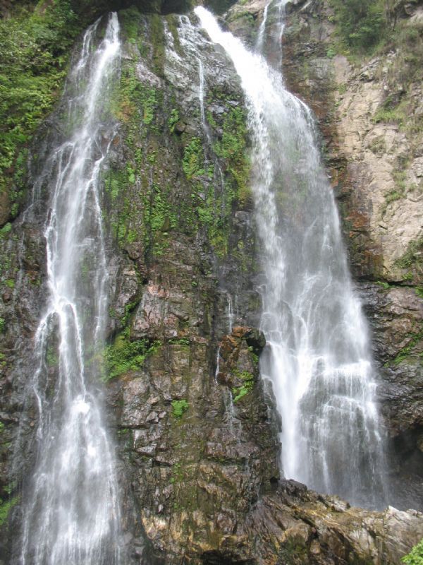 悠然赏竹,不觉肚内咕咕。车行至一家佬俵餐馆,我们稍作休整。晌午刚过,便赶赴水口瀑布。顺着山间小路迂回而下,脚下清澈流水始终蜿蜒相伴,潺潺中不时传来阵阵叮咚,伴着我们的欢笑,打破了午后林荫中的宁静。上午时强时弱的阳光,此时也已经完全藏匿在了不知处。山路多半平坦,突遇稍陡之处,已闻远处哗哗作响之声。耐住急切的心情,我们握紧栏杆,一步步走下石阶,突然转过一个弯,顿时一股清新而甜爽的气息萦绕左右,眼前一亮,雪白的水帘飞流而下。继续沿石阶来到瀑布脚下,清风吹过,水花四溅,落在身上,瞬间莹润心头,仿佛自己已经随着这股清新的气息而飘飘然然。虽然天色稍阴,没有观赏到久负盛名的彩虹之景,可这花飞珠泻、雾气氤氲中的恬静清爽,对于久居都市高楼之中的我们,已经弥足珍贵了。流连片刻,小雨适时而至,清爽之气相伴,我们走上折返的曲曲小路,一路走着,愉悦之情溢满脸上心头。