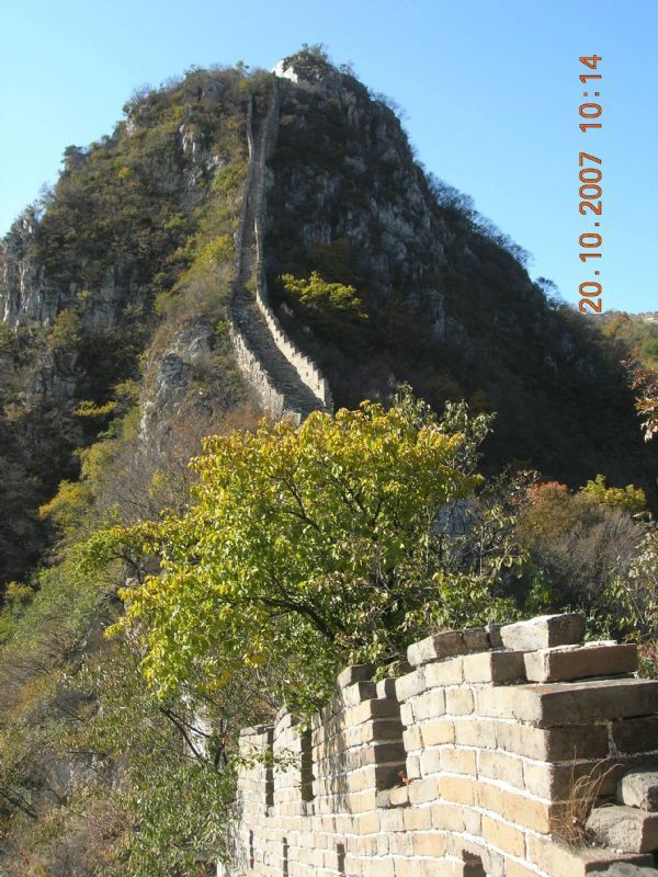 我们没有考证长城的历史年代,我们只看到了历史留给它的残破痕迹,岁月的磨砺,风雨的冲刷到处是坍塌、断裂。然而,当我们一踏上这块土地,蹬上长城放眼望去,高山峻岭、群山环抱、延绵不断的长城映入我们眼帘,仿佛一幅幅壮美画卷。鹰飞倒仰是箭扣最险要的制高点,它建在一个突兀的山体之上的敌楼上,在本来就跌宕起伏的群山间拔地而起,就连鹰飞到这里也要倒仰向上奋力高飞。