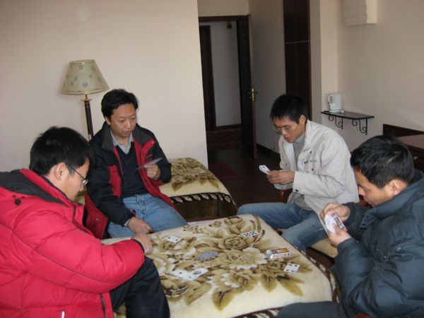 为了丰富本次年会的内容,放松一下大家忙碌一年的心情,组织者提出了举办一次拖拉机比赛的想法。想法一经提出,立即得到了大家的热烈响应。实验室主任许枫研究员首先报名参加,听说许主任在学生时代就是有名的纸牌高手,很少有败绩,大家都想借此机会见识一下许主任的实力。室里其他职工和研究生也有很多都是业余爱好者,大家纷纷报名。最后,全室共有12人报名参加,经过分组抽签,分成3组捉对厮杀。我们定了统一的规则,并将每轮比赛时间定为1个小时进行限时赛。