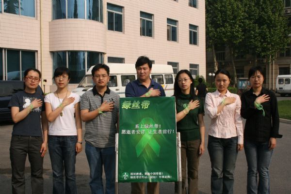 活动开始后,各位早早到来的老师和同学纷纷下车,表示对灾区人民的关爱和绿丝带活动的支持,虽然我们这次是义务宣传绿丝带精神,不接受捐赠,但还有不少老师和同学积极表示要再次捐款捐物,尽一份责任。