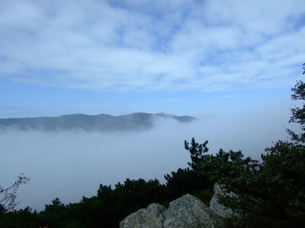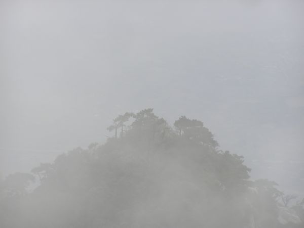 有十来个人为了这个可能登上了“犁头尖”,快到山顶的时候没有石阶路了,只能沿着山石往上攀爬,试着向上走了几米,视野并未见清晰,树木反而有所遮挡,我也只能叹息天公不作美,准备下山集合了。回返到半程,不经意抬头四望,雾已经消散了些,远处隐隐约约出现湖泊的轮廓,我们“坚信”那就是鄱阳湖,近点的地方雾气不断的翻腾、流转,间或在白色的云雾之中露出一角苍翠的山尖。这样的美景应让我们很满足了,消除了辛苦爬上山却一无所获的抱怨。