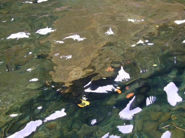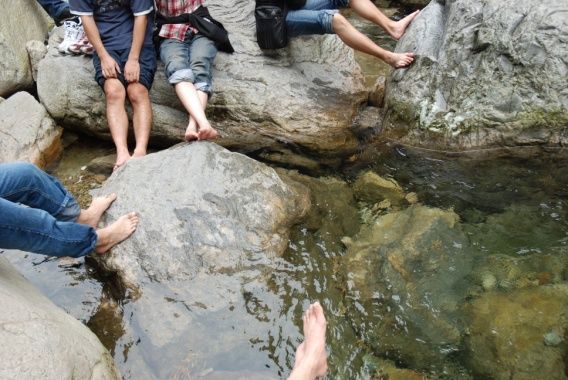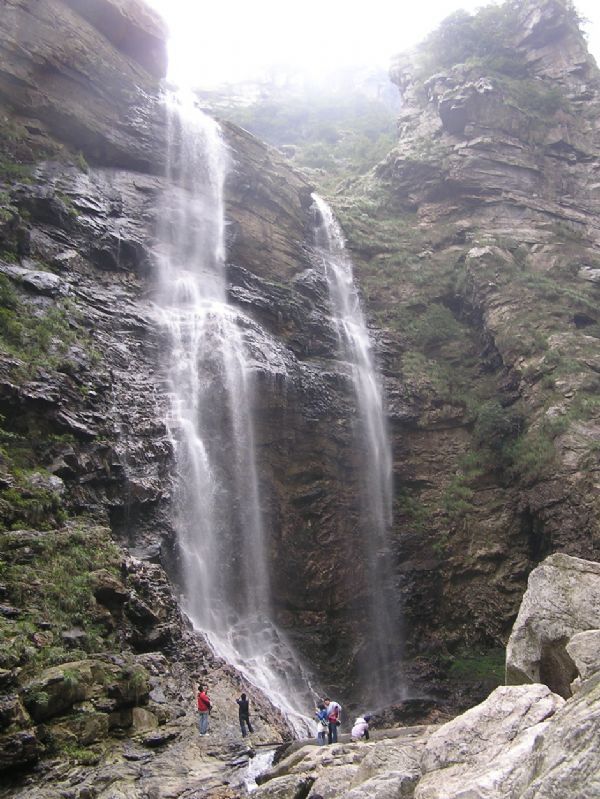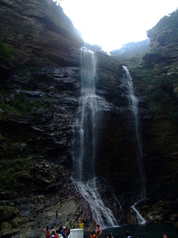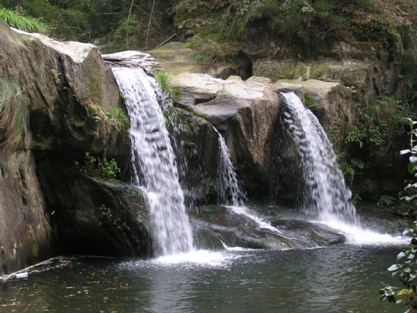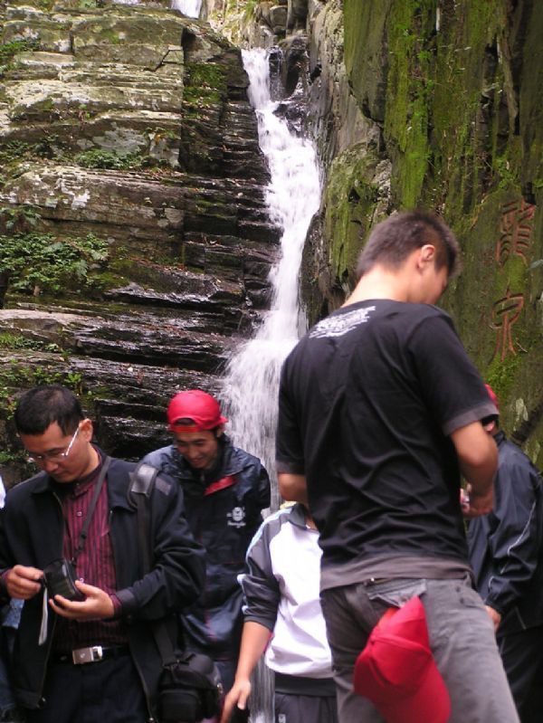 站在一块碧玉似的玉龙潭边,抬头望见一条银链扑面而来,被突出的山崖稍稍阻挡,又气势不减的继续下坠。飞溅的丝丝水汽夹杂在空气中,带来清新的气息。银链落入湖面一角,并没有扰乱整体的平静,充盈的湖水从一个小缺口流出,在岩石中曲曲折折的继续向前。不少游客坐在石头上,将脚伸入溪水里,脸上露出惬意的神情,我们也没能抗拒这种诱惑。水很凉,放一会儿又抬出水面暖和一阵,又放进水里,感觉刚刚攀爬行走的疲劳都没有了。耳旁听见的是瀑布落下的水声,入眼的是绿水、绿树,坐在被阳光照耀的石头上用溪水泡脚,莫非古代庐山的隐士过得就是这样的日子?