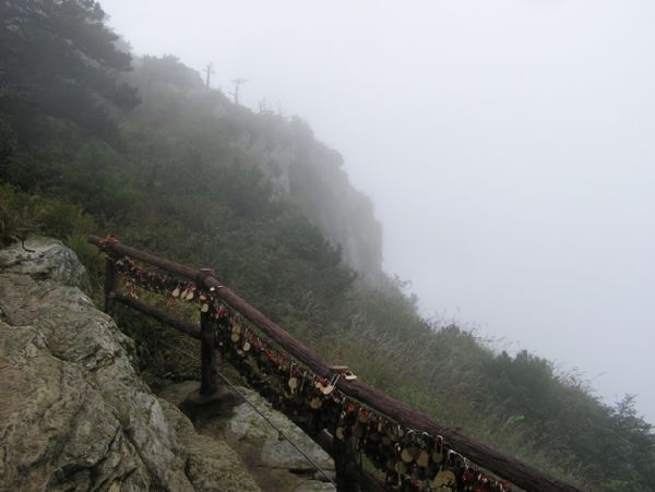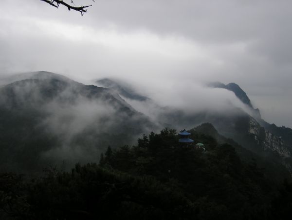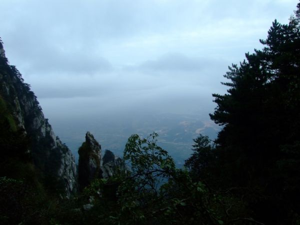 第一、二峰相隔很近,景色差异也不大,山色在云遮雾绕中若隐若现。第三峰与第四峰相隔更近一些。三峰顶部只能在岩石上凿出来的落脚处攀登,顶峰也是一块巨石,攀上石头,往前望是茫茫云海,看不得很远,回头看,忍不住惊叹的叫出声来。身后远处不知是哪一峰,山体上长满秀芹的树木,呈现出或青翠或墨绿的色彩。最高处的山背上沿着优美的曲线整齐的生出一排挺拔的树木,托着几乎就在树顶的白云,真是一幅美丽的泼墨山水。四峰大概是由于海拔最高,四周更是只见白雾,除了峰壁上刻着的“天地壮观”四个大字几乎看不到其他的景物。坚持到第五峰的只有十一个人,“视无障碍”名副其实,峰前再没有任河遮挡,可以看山下广阔的土地,有让人大声呼喊的冲动。上山前听导游说从第五峰上也能看到鄱阳湖,可惜还是有雾,看不太真切。