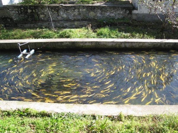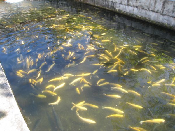我们被一水池吸引,鱼儿们悠闲地游着,没有因我们的到来而被惊动,有人试着扔干草下去,一般地鱼儿会以为是食物而纷纷过来,可是这些鱼儿很聪明,对我们的假的食物丝毫不理会。我们沿着池边走又发现很多水池,鱼池按鱼儿体积大小分门别类,其最大的鱼是我未曾见过的。在道路旁边,有一个水池很奇怪,鱼儿们集体转圈圈,从外面看水池里并排着几个由鱼儿组成的圆圈,很壮观,也很有趣,我们一时还不能说明其中的缘由。