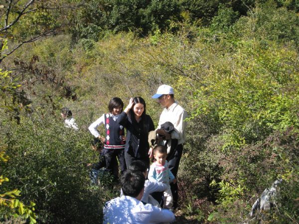 看完鱼区,我们便开始爬山。开始,山坡不陡,而且有石头砌成的山路,所以这一段很轻松。后来,山坡很陡,土路上有散落的小石子,若不小心就很容易滑倒,这是对我们的挑战,虽然爬得艰难,但最后我们还是胜利到达山顶。李老师的小孩也勇敢地爬到了山顶,路上家长们曾几次劝他下山,他丝毫没动摇。