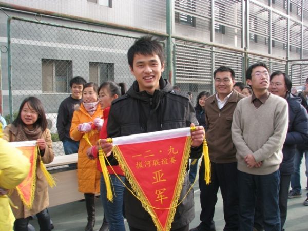 第二场,我们对阵过程所,眼看着他们个个体形彪悍,顿时不敢轻敌,体育部长蔡宇师兄一直鼓励大家,输赢没关系,关键在于一种精神。于是,我们抱着轻松的心态迎接挑战。每个人都严阵以待,压低重心,准备哨声响起。开始的一刹那,就明显感觉到有一股力量拉着我们往前走,大家齐心协力,力争扳回局面,但在僵持了一会之后,终于还是不敌对手,负于对方。虽然输了,但是大家尽了全力,体现出非常强的班级凝聚力和团结精神,每个人脸上都洋溢着开心的笑容,最终赢得一枚锦旗而归。