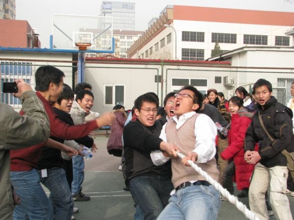 第一场,我们与电工所的同学对决,一局一胜制。大家按照既定的队形准备好以后,都憋足了一股劲,跃跃欲试,个个要使出浑身解数,一股必胜的气势贯通场内外。哨声吹响,赛场上顿时热闹起来,加油声,呐喊声,助威声,声声入耳。随着“加油加油”、“一二、一二”的助威节奏声双方展开对战。对手的实力不可小觑,虽然我们一开始就有了一定的优势,但是由于双方实力相差不大和队形左右的不均衡,曾经一度绳子猛烈的左右摇摆起来。尽管如此,我们还是抱着必胜的信念,力往一处使,大家齐心协力,终于将胜利牢牢地握在了手中。大家欢呼雀跃,这样我们成功晋级了前四强,期待着下一轮的胜出。
