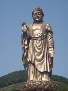进入胜境门楼,游览了佛足坛、洗心池,沿着菩提大道前行就是九龙灌浴广场,广场四周为转经廊,88米高的青铜灵山大佛巍然屹立。