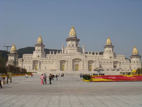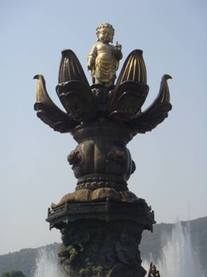 中午十一点钟 “九龙灌浴”的大型景观表演开始了,当《佛之诞》音乐奏响时,巨大的六片莲花瓣徐徐绽开,一尊高达7.2米全身鎏金的金身太子佛像,一手指天,一手指地,从莲花中缓缓升起,这时,九龙口中一齐喷射出数十米高的水柱,为太子佛像沐浴。顷刻间,广场四方鼓乐齐鸣,喷泉百态千姿。太子佛像在巨幅水幕中顺时针环绕一周,象征着“花开见佛”、“佛光普照”。随着乐声渐弱,莲花花瓣包裹着太子佛像缓缓合拢。东海站的老同志们纷纷拿起相机留影纪念。