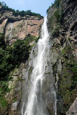 第一天中午团队在溪口镇用了午餐,下午我们先游览雪窦山,张学良将军的第一幽禁地,蒋介石的避暑山庄—妙高台,东浙第一瀑---千丈岩和蒋母墓道。雪窦山风景区包括徐鳧岩、妙高台、千丈岩、三隐潭等多处风景点以及雪窦寺、蒋母墓道两处历史古迹。我们首先来雪窦山高风景区,登高远望,雪窦山群山环抱,地势起伏跌宕,林木葱茏翠绿。雪窦山最好玩的地方应该算是妙高台和徐鳧岩,妙高台曾经是蒋介石避暑居住的地方,因政治色彩浓厚成为游客必到之处,其实,妙高台也是一处风景绝佳的地方,站在妙高台上看去,四周群山环抱,绿树婆娑,中间溪水集聚成湖,观光亭、游船点缀其间,山水相映,湖水斑斓,天地间透着灵气。蒋介石选择雪窦山最高点修建妙高台,修心养性,运筹帷幄,真正是风水宝地,美哉、妙哉。徐鳧岩景点更是鬼斧神工杰作,可以直接下到瀑布底下,仰视瀑布,另有一番“飞流直下三千尺”的感觉。我们因为时间关系虽然没能沿着400多级的台阶下去,但是,站在观瀑亭处纵观瀑布全景也是别有一番风味。依栏杆向下观望,瀑布全景尽收眼底,一瀑飞挂千丈崖上,犹如天水飞泻而下,瀑水遇到凸出的岩石,又被辟成数条玉带,激起层层水雾。透过水雾望眼瀑底,一潭清水泛着绿意飞瀑落处,泛起洁白的水花。美不胜收。