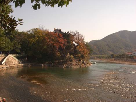 经过在溪口镇一夜安静的睡眠,呼吸着溪口清新的空气, 第二天上午,我们来到溪口古镇,迎面就是高大雄伟的武岭门,看似古城的城门。穿过武岭门,眼前豁然开朗,原来古镇很广阔,感觉来到了所谓的“世外桃源”一般。古镇依水而建,一条笔直的道路贯穿全镇,新旧建筑错落有序。文昌阁、丰镐房、玉泰盐铺(蔣家是镇上的盐商)都在道路一旁。蔣介石从小生活在这里,在这里留下了许多烙印:文昌阁是蒋介石的別墅,站在别墅的露台上看去,剡溪就在前面缓缓地流着,似在述说着绵延的历史,溪水中突出的石板上一些村姑村妇们正在一边嬉笑一边洗衣洗菜,清澈见底的溪水又吸引了我们中的不少人,五室的一些职工没能经受住诱惑,也脱掉鞋子,挽起裤腿下河戏水去了,中午回来时还捉了些小鱼虾,这下孩子们可有东西玩了……远处,两座大山在此交会,远远望去象两条巨龙分卧左右,景色十分宜人,多么恬静的人与自然和谐相处的画面,我们欣赏着快门一按留下了永久的记忆。古镇建筑风格中西合璧,有古朴典雅的文昌阁、商铺、民居,也有西洋风格的小洋房。