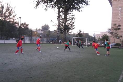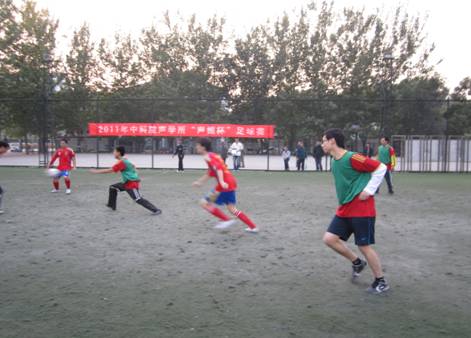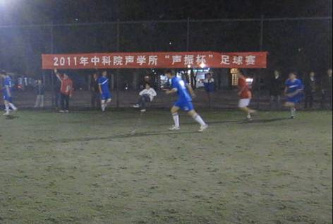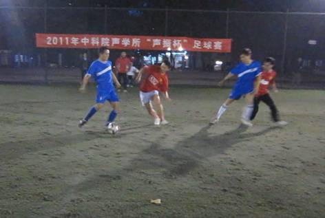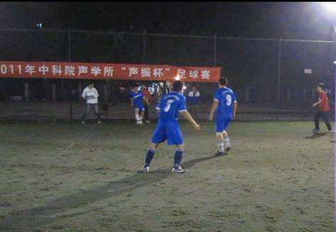 18:00,夜幕降临,凉风渐起,赛场上却一片热情似火。医用声学实验室和院语言声学与内容理解重点实验室展开了新的角逐,这两个队伍向大家展示了什么是势均力敌,他们都有着精湛的球技和严密的防守,上半场以0:0打成平手。下半场开场,医用声学队的第一粒入球打破了场上的沉寂,1:0。夜色愈深,大家的热情也如夜色一样越来越浓,灯光下能看见晶莹的汗珠挂在球员们坚毅的脸上。语言声学与内容理解重点实验室毫不示弱,奋起直追,终于以1:1再次平手,旗鼓相当的两支队伍将该比分维持到了结束。