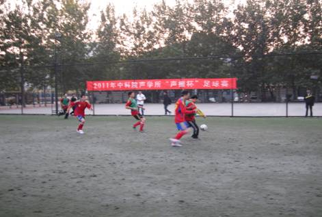 10月18日下午,国科图前中关村体育场异常热闹,足球场中身着各色队服的球员摩拳擦掌,为即将开始的比赛做着准备,围栏上高高悬挂的横幅向路人和场外观众宣传着:中科院声学所“声振杯”足球赛正在火热进行中。