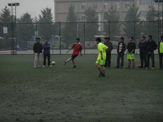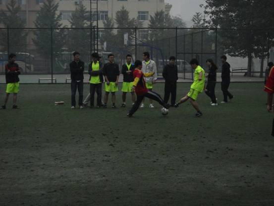 中午12:30,天气虽然很冷,但是国科图前的足球场上仍然聚集了一群活力四射的青年们。今天场上的队伍分别是综合声纳与噪声与振动。本场比赛最终噪声与振动以3:1的比分战胜综合声纳。
