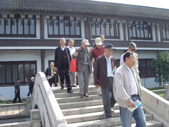 行近一个小时的车程,来到了目的地——素有吴越名镇之称的枫泾古镇。在导游的带领下,大家首先参观了中国农民画生态休闲园,欣赏了融会上海金山、吉林、天津、陕西,云南等十大画乡共十五户农民画的“丹青人家”。农民画源自古老的民间艺术,以家乡风土人情为主要题材,融合刺绣、剪纸、蓝印花布、灶头壁画、雕塑、漆绘等民间艺术表现手法,运用大胆的艺术夸张和强烈的色彩反差,以拙胜巧。爱好丹青的退休老同志和农民画家互相切磋,相谈甚欢。接着参观园内的垂钓鱼塘、四季瓜棚田园景点,小桥流水、绿荫环绕,老同志们边走边聊,沉浸在宁静、惬意的风光中。中午则在名为“灶头屋里”的餐厅用餐,品尝金山当地的农家特色菜肴,别有一番味道。