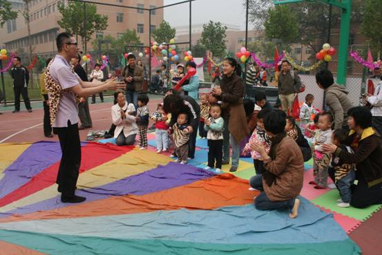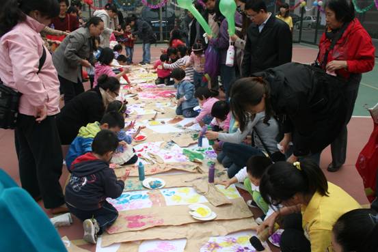 在美丽的新园区里,孩子们拿着气球和小礼品开心地玩耍起来。园区内专门为孩子们设计了各种互动小游戏。根据宝宝们不同的年龄阶段,分为几组游戏:和爸爸妈妈一起say hello、涂涂画画、投篮、泡泡游戏……很快的,爸爸妈妈和孩子都积极地参与到游戏当中来。随着音乐的律动,孩子们开始又唱又跳,欢笑声、嬉闹声、加油声声声入耳,让平时庄严而肃穆的园区在此时充满着浓浓的温情。
