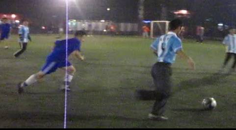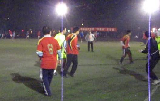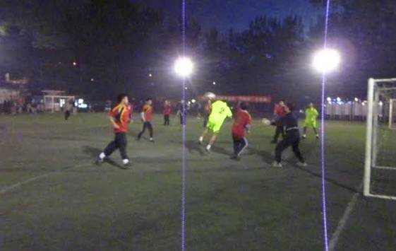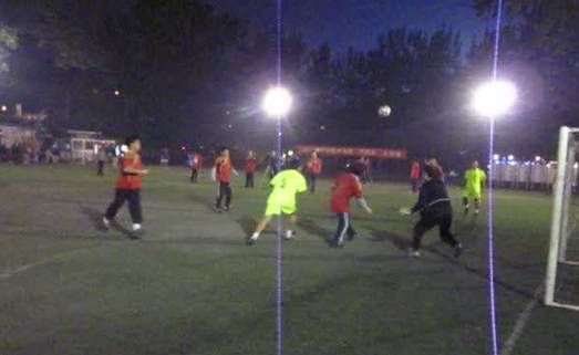随后进行的比赛更加激烈。身披黄绿色战衣的噪声与振动代表队和身披红色战衣的机关联队代表队展开激烈的角逐,尽管天色渐黑,队员们仍然快速如风。开场不多久,噪声与振动队6号球员就成功攻破对方球门。机关联队奋起拼搏,迅速展开反攻。,他们由于缺乏两位主力在场,显得有些力不从心,在上半场即将结束之时,6号球员再次进球,将比分变为2:0。下半场一开始,机关联队借助成功断球的机会,成功扳回一球。由于机关联队替补队员不足,场上的球员逐渐疲惫,噪声与振动代表队抓住机会多次组织进攻,屡立战功的6号队员在队员的配合下又连进两球,最终噪声与振动代表队以4:1战胜机关联队,成功晋级。