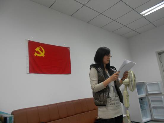 会议在庄重而热烈的气氛中按照程序进行,申请人邱长春、侯娇丽认真宣读了自己的《入党志愿书》,分别汇报了自己对党的认识、入党动机、个人情况以及家庭和社会关系等情况。作为邱长春和侯娇丽的入党介绍人,李俊红老师和李红浪老师分别对两位发展对象进行了介绍,对他们在学习、科研、生活等方面的表现做出了肯定,同时指出了他们在各方面的缺点和不足。在支部成员的热烈讨论之后,支部内的正式党员对申请人是否符合转为中共预备党员的要求做了举手表决,一致同意将邱长春、侯娇丽两位同志吸收为中共预备党员,随后学生党员吕宁宣读了支部大会的决议。