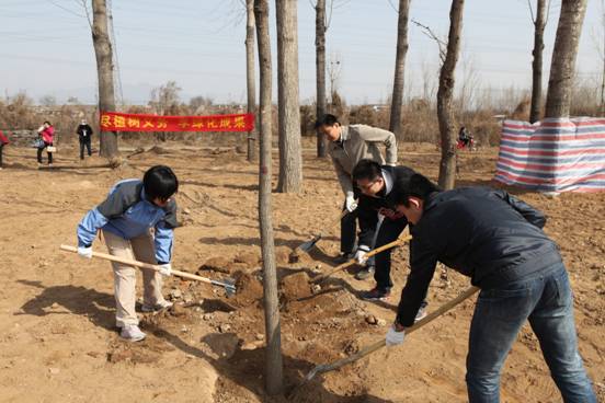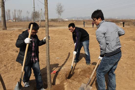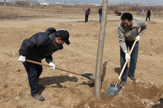 此次植树活动,选择在急需植树绿化的怀柔区庙城镇滨河森林公园进行。在工作人员对植树要领进行详细讲解后,在张书记的带领下,大家两人一伙,三人一群,抗苗、打底、扶苗、填土、踏实、培水埯一气呵成,不一会功夫,就顺利地完成了分配的任务。