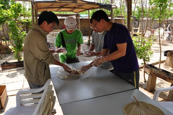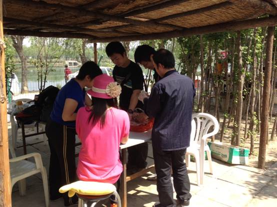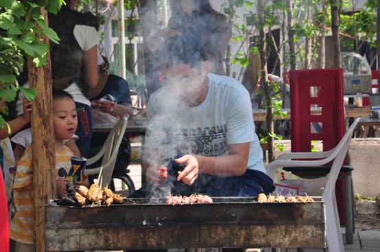 在这样的景色中,大家开始三五成群的或打羽毛球、或踢毽子,开始各项活动。接近中午时分,支起烤架,大家开始分工合作,有生火的,有清洗食物的,有穿串的,还有烤串的,每个人都开心的准备着。不一会儿功夫就香味四起,刚开始有的烤焦了,有的还半生不熟,可渐渐的似乎掌握了诀窍,劳动成果越来越有模有样。众人享受着自己劳动带来的美味。