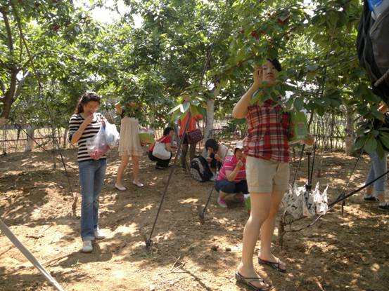 第二天上午驱车来到密云县郊区的生态樱桃采摘园,看到红艳欲滴的樱桃,大家明显都很激动,二话不说就开始边采边尝。绿叶遮蔽中,红色的樱桃大而晶莹,让人垂涎不已,入口酸甜,回味无穷。诸位忙碌于科研和行政工作的巾帼们,来到果园里也毫不含糊,智取樱桃,登梯上树,好不欢乐。快乐的时光总是一闪而过,临近中午,大家带着自己的战利品离开果园,这时才发现已经被骄阳晒得周身通红。