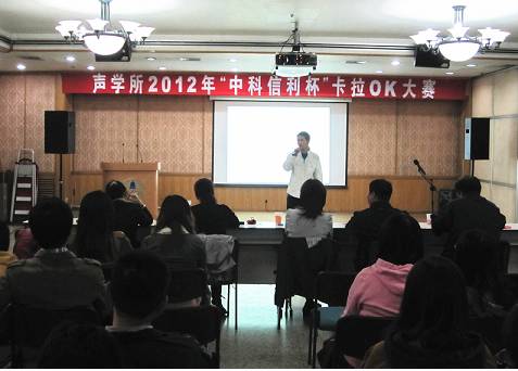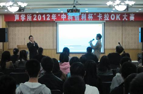10月19日晚,大家期待已久的 “声学所好声音”—声学所2012年“中科信利杯”卡拉OK大赛预赛在DSP楼多功能厅如期举行。该比赛由所工会、所团委主办,所研究生会文艺部承办,并由中科信利实验室大力赞助。旨在丰富全所学生及职工的业余生活,并给声学所广大歌唱爱好者提供一个交流切磋的平台。