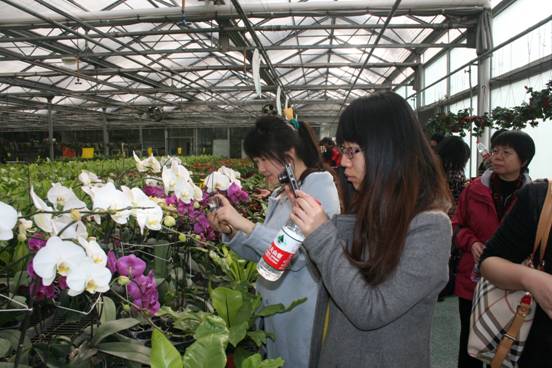 接着走进的是精品花卉厅,各色美丽的蝴蝶兰,仪态端庄的红掌,鲜艳的非洲菊,可爱的蒲包花,无不引得人驻足流连。看过了妖娆的鲜花,又来到了朴实的“农家小院”,在蔬菜瓜果园,可以看到常常出现在餐桌上果蔬,那些看似樱桃的番茄,长在头顶的地瓜,五指型的茄子,混搭风的南瓜,都让人觉得异常惊奇和新鲜。大家一边观赏和拍照,一边猜测着这些果实的品种,欢声笑语不断于耳。告别硕果累累的农家小院,一不小心闯入了热带植物馆,一瞬间有种冰火两重天的感觉,高大葱绿的香蕉树,年过百岁的古榕树,这里的每种植物都充满了勃勃的生命力,浓郁的绿色似乎要满溢出来,但作为人类,苦于不能适应这种环境,于是迅速逃向了沙生植物馆。虽然是沙地,但仙人球也是一派欣欣向荣,走过了这里才知道,原来一些厚叶植物也可以在沙地生长。接着,又依次观赏了植物生肖园和茗赏百花厅,一个春光明媚的下午就在轻松愉快的赏花中结束了。