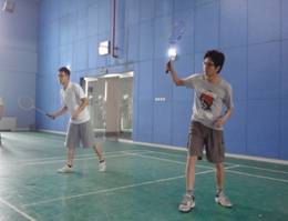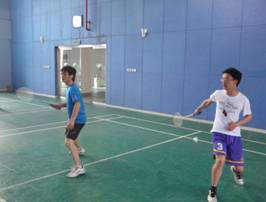 第二场是男双的比赛,我方派出的是来自中科信利的两位同班又同实验室的吴同学和黄同学(下右图)。他们两位经常在一起配合打球,相互配合较好,实力也不俗。而对方显然是派出了他们实力最强的男双组合来力争在总比分上扳回一城。比赛伊始,双方比分交替上升,一直来到10:10,但是我方选手较多运用平球的弱点也在这段试探期被对方摸清楚了。对方选手开始发力,通过中场拦截、后场拉吊等很快就占据了主动,赢下了第一局比赛,而第二局我方选手也没能找到破解对方进攻的妙招,很快败下阵来,以0:2的大比分输掉了比赛。