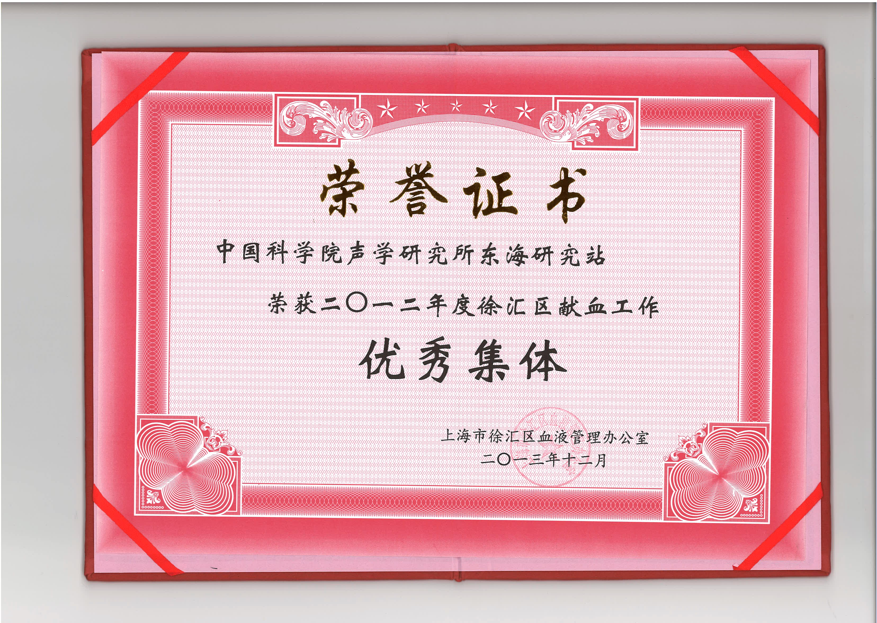 近日,上海市徐汇区血液管理办公室传来喜讯,中科院声学所东海研究站获得“2012年度徐汇区献血工作优秀集体”荣誉称号。该荣誉是对我站献血工作成绩的认可,也是对我站职工、研究生积极弘扬无私奉献精神的鼓励。