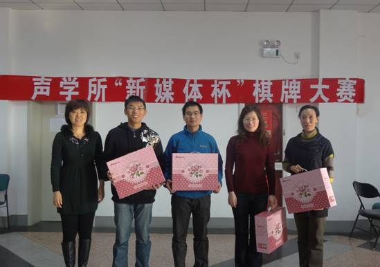 2013年12月25日,由声学所工会、声学所团委主办,国家网络新媒体工程技术研究中心赞助,声学所研究生会、国家网络新媒体工程技术研究中心团委承办的2013年声学所“新媒体杯”棋牌赛在声学所北二楼活动中心圆满结束。声学所所长王小民,党委副书记倪宏,所工会、职代会主席李平,所务助理、所工会、职代会常务副主席周秀霞以及本次比赛的赞助方国家网络新媒体工程技术研究中心副主任邓浩江出席了闭幕式。