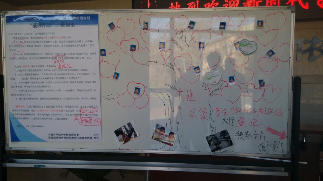 12月8日至12日,青年志愿者协会在全所范围内进行宣传,并分别在DSP楼一层和崇福楼一层展开了心愿卡的展示。展示效果非常好,51个愿望中的50个愿望被认领。