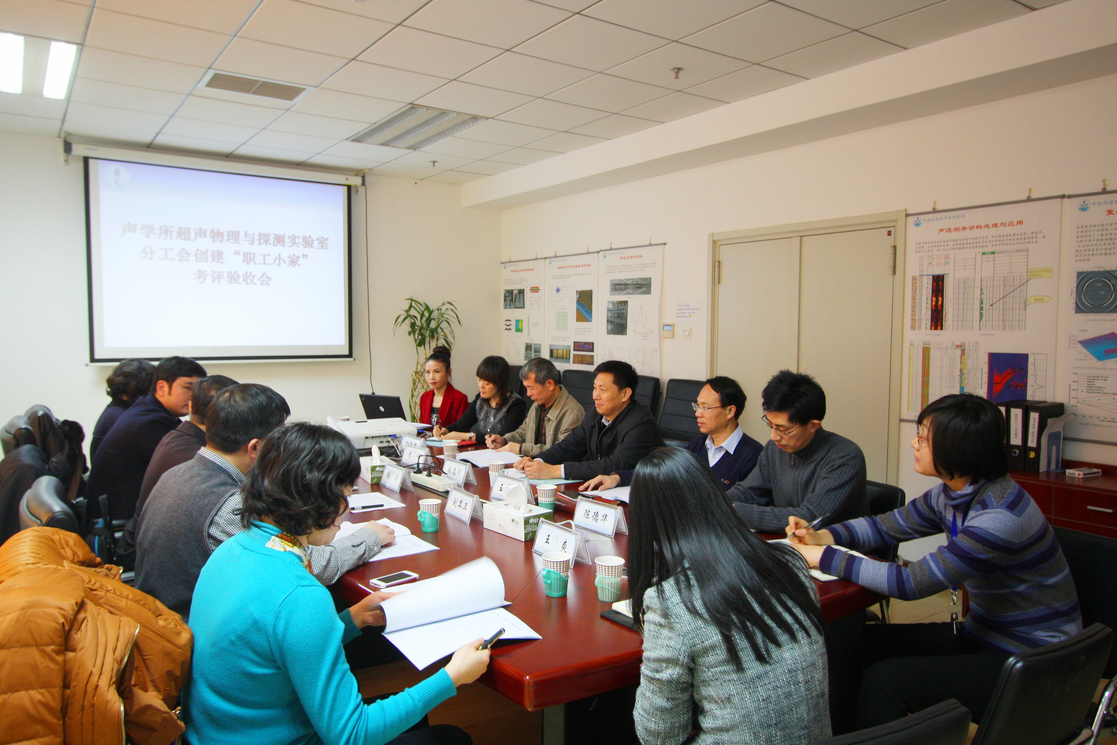 为了更好地发挥职工在科技创新和文化建设的重要作用,超声物理与探测实验室分工会(以下简称“超声分工会”) 在所党委和所工会的领导和帮助下,积极开展了创建“合格职工小家”的活动。2014年12月24日下午,院工会组织在声学所举办了“超声分工会”创建“合格职工小家”现场考评验收会。考评验收组由院工会副主席张平担任组长,验收组成员包括院工会办公室主任王登礼、院工会常委刘卫卫、化学所工会常务副主席李静、理化所工会常务副主席王爽。我所党委书记张春华、工会主席李平、常务副主席周秀霞、实验室主任王秀明、超声支部书记陈德华、实验室室委会主任毛捷、分工会主席黄宝华以及分工会其他委员等同志参加了验收会。