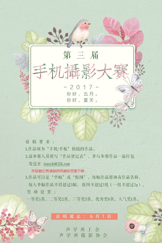 由声学所工会主办,声学所摄影协会承办的声学所第三届手机摄影大赛圆满落幕,此次手机摄影大赛共收到摄影作品150余幅,最后通过评委老师的打分及网络投票,选出一二三等奖及优胜奖若干名。