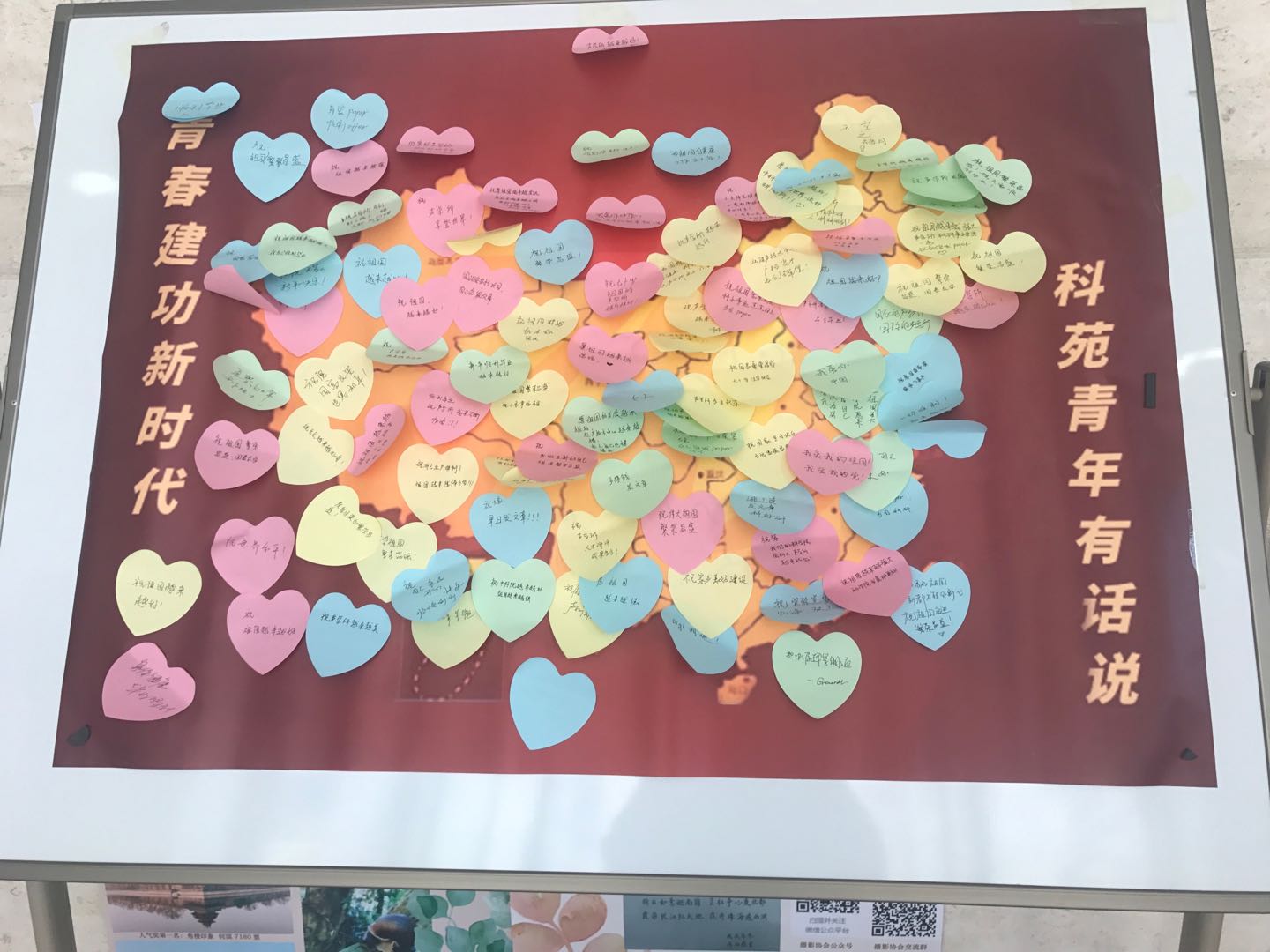 志愿者们准备了彩色的心愿签和笔,精心设计了印有中国地图图案的心愿墙,并且在现场竖起了团旗。路过的职工和研究生们纷纷在心愿签写下自己的愿望,将其贴到心愿墙上展示。