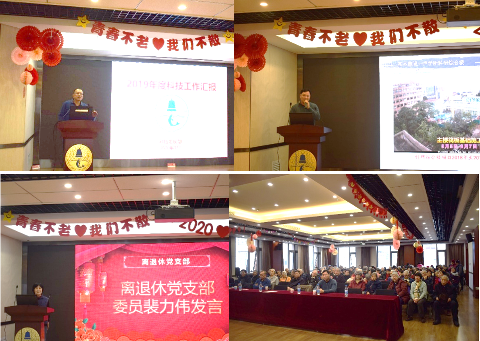 张春华书记向离退休职工通报了2019年声学所在党的建设、人才培养等方面的工作概况,同时感谢离退休老同志一直以来对所里工作的关心与支持,并致以诚挚的问候和祝福。科技发展部主任王强、资产条件保障部主任程洋分别介绍了2019年度声学所的科研发展、基本条件建设情况。人力资源部做2019年度离退休工作总结,离退休支部委员裴力伟做2019年度离退休党支部工作总结。