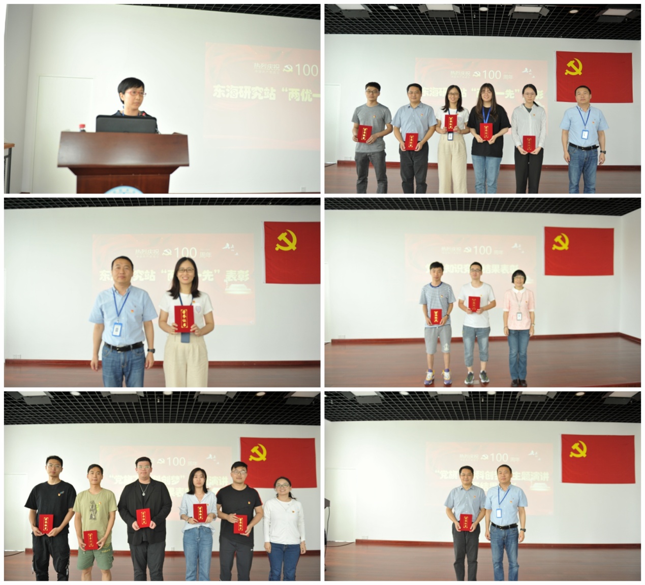 丁培宣读了《东海研究站党委关于表彰优秀共产党员、优秀党务工作者、先进党支部的决定》,并进行了颁奖表彰仪式。她强调在庆祝中国共产党成立100周年之际,全站各级党组织和广大党员要学习先进、争当先进,不忘初心,牢记使命,奋发有为,实干争先,全面完成东海研究站各项工作任务目标,努力谱写科技创新发展的新篇章。同时,大会为“庆祝建党百年 勇当科创先锋”党史知识竞赛和“党旗下的科创梦”主题演讲比赛获奖个人颁发了荣誉证书。