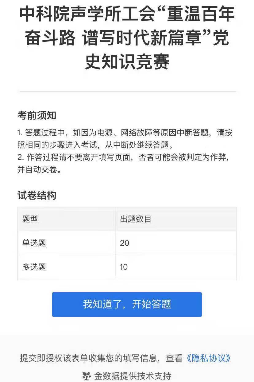 为深入学习贯彻习近平总书记在党史学习教育动员大会上的重要讲话精神,按照所党委部署,在庆祝中国共产党成立100周年之际,声学所工会组织开展了“重温百年奋斗路,谱写时代新篇章”党史知识线上答题活动。全所共有427名同志参加了答题,产生了702条答题数据,368名同志取得了满分的成绩。
