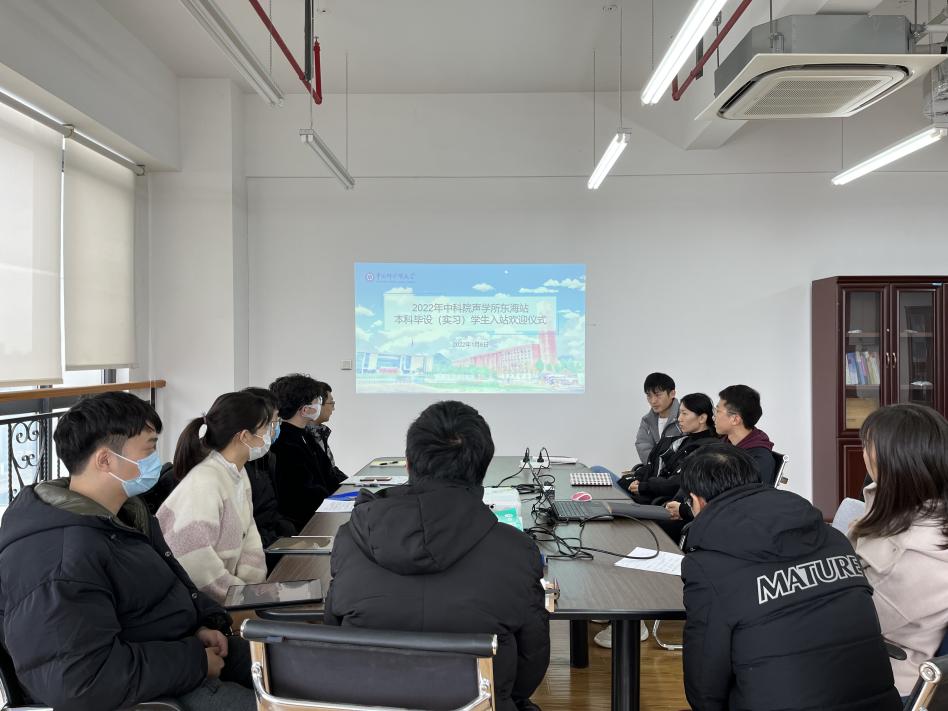 2022年1月6日,中国科学院声学研究所东海研究站举办2022年度联培与推免本科毕设(实习)学生入站欢迎仪式。水声工程研究室洪峰副研究员主持,人教科翁汝莲、超声技术研究室陈友元副研究员,推免与联培相关本科学生以及在读研究生参加了本次会议。