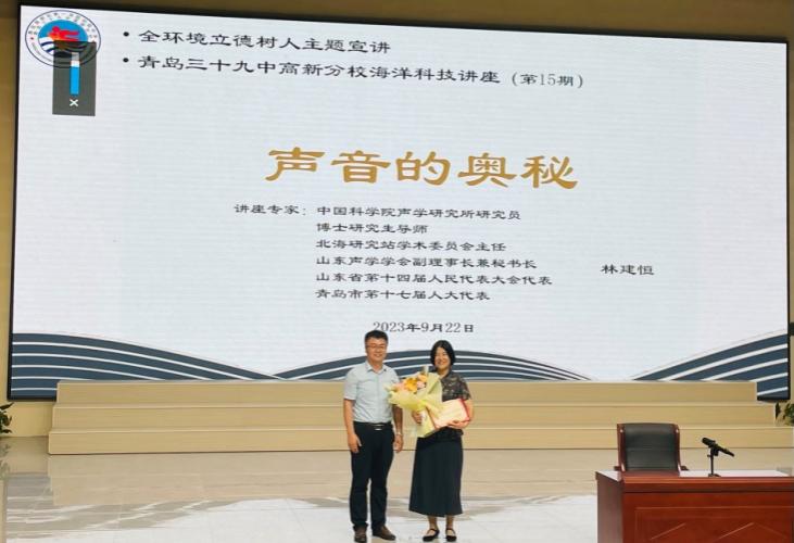 讲座结束后,青岛三十九中高新分校校长王振敏为林建恒研究员颁发学校科学教育专家教师聘书。林建恒表示,非常高兴受邀参加这次活动,作为中国科学院声学研究所北海研究站的一名一线科研人员,她将继续支持学校开展科学教育,指导帮助更多的学生开展科学探索,唤起同学们热爱科学、崇尚科学的热情,期待未来科学之花能够处处开放。林建恒也欢迎学校老师和同学们来到北海研究站,走进声学实验室,身临其境地感受声学的魅力。