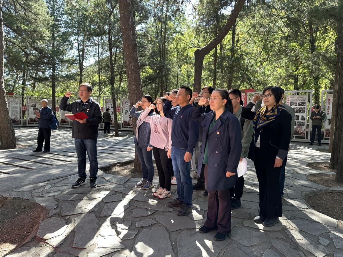 在“一二 九”运动纪念亭前广场上,超声学党总支第二党支部书记李俊红带领党员重温入党誓词。“我志愿加入中国共产党……随时准备为党和人民牺牲一切,永不叛党。”铿锵有力的宣誓声在林间回荡,表达了大家对党的无限忠诚、热爱和听党话、跟党走的坚定决心。