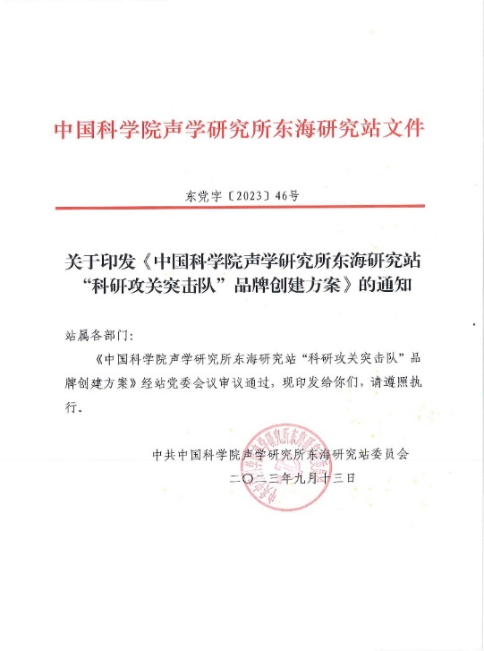 为把“科研攻关突击队”品牌打造成可推广可借鉴的模式,站党委牵头制定了《中国科学院声学研究所东海研究站“科研攻关突击队”品牌创建方案》和创建流程图,形成了 “八个一”的标准创建流程。