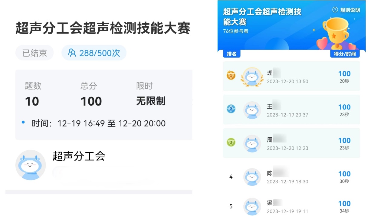 本次技能大赛得到了实验室广大职工的积极响应,参加人员包括多位研究员,题库知识的专业性还得到了超声检测方面的专家的肯定。大家通过线上答题和线下交流,理论知识和实际操作技能进行了结合深化。比赛期间,大家通过多次答题,不断提高准确率,提升成绩,力争上游,排行榜上不仅名次不断刷新,大家的成绩和答题速度也在不断刷新纪录。