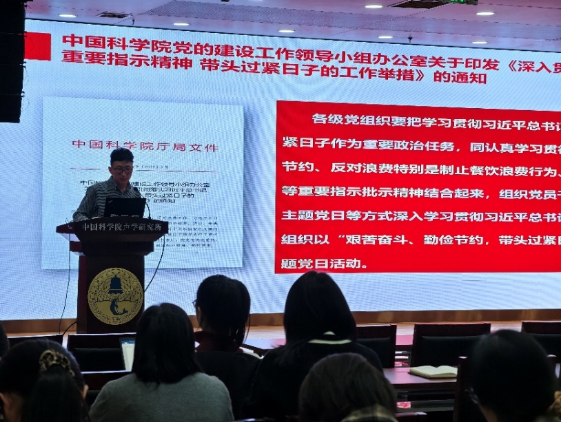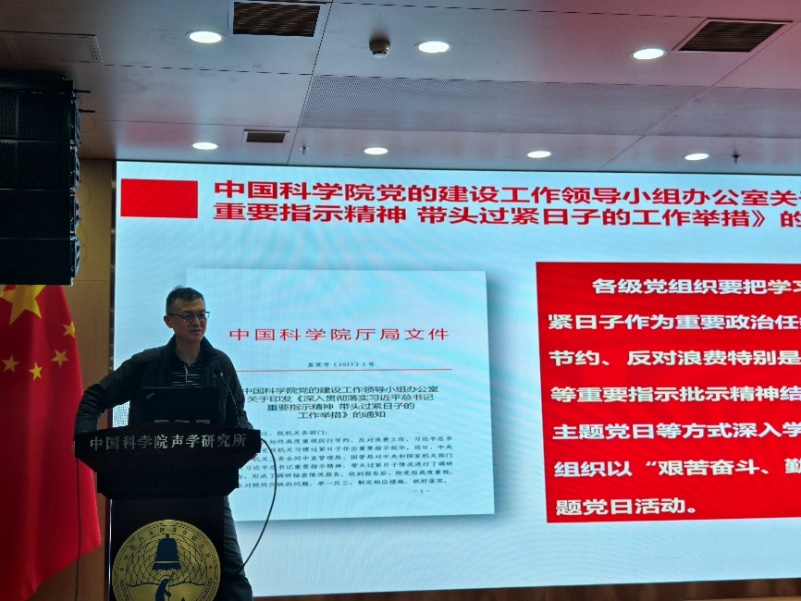 王海斌结合张仁和院士“在废弃打印纸反面演算”等勤俭节约事迹,号召全体党员将节约意识融入科研日常,以点滴行动践行勤俭美德。他强调,实验室要加强科研经费管理,推动“开源节流”;在大项目、大工程中注重提质增效,夯实基础研究,为科技自立自强提供重要支撑。