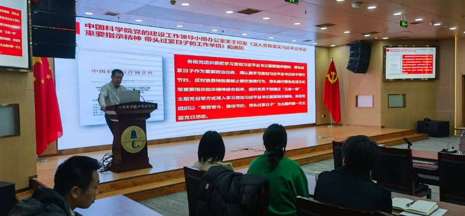 会议开展“艰苦奋斗、勤俭节约,带头过紧日子”主题党日活动。党支部书记李俊红带领全体党员认真学习贯彻习近平总书记关于厉行节约、反对浪费特别是制止餐饮浪费行为、带头践行绿色生活方式等重要指示批示精神。他强调,要发扬“艰苦奋斗、勤俭节约”的优良传统,切实落实过紧日子的要求,从小事做起坚决杜绝奢靡浪费等现象,鼓励科研人员能够从前辈的拼搏中汲取精神养料,勇于攻坚克难。